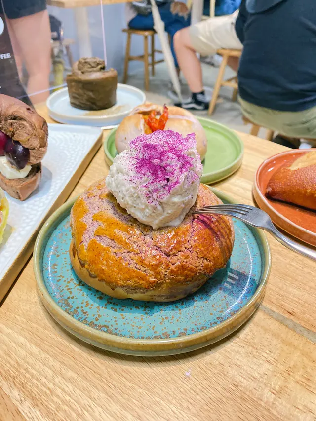 呢個係我地去嘅weekend special offer🤣🤣每日限量!見到個個都叫我哋都輸蝕,上到黎個菠蘿包好大個同埋好香!一切落去好有驚喜,有流沙奶皇同麻糬(((o(*゚▽゚*)o))),奶皇好香令到我又食停唔到口,加埋麻糬同菠蘿包,又有酥軟,煙韌,同沙沙嘅感覺,幾種口感融合左,無得輸,芋泥雪糕真係好好食,佢有一粒粒嘅芋泥,成個口感又昇華左🥲🥲,我會比mvp佢😎