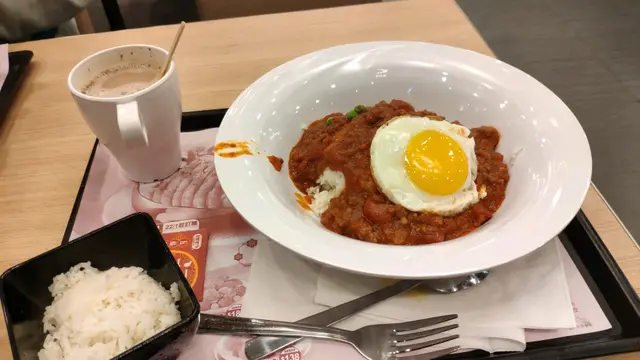 唔理啦!叫嘢食!我食嘅係煎蛋蕃茄免治牛飯,呢個飯唔知點解深得我心,我係勁鍾意食佢,但係我阿媽成日都話呢個飯核突,奇怪……