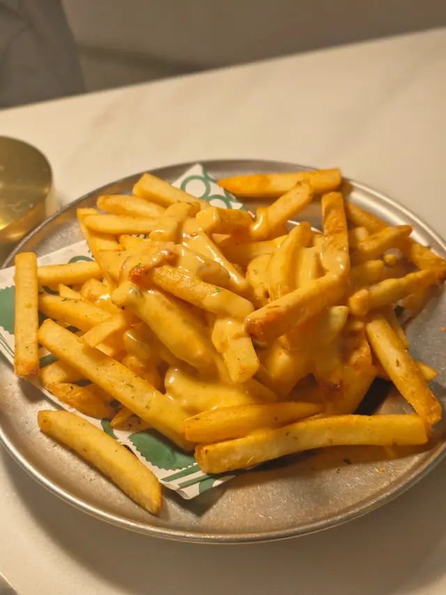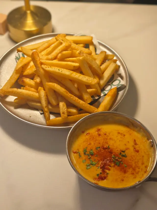 熱辣辣嘅粗薯條澆上芝士瀑布🧀,芝士香濃到飄幾米,薯條外脆內軟,每條都掛住拉絲芝士,邪惡又過癮,係食意粉嘅完美配菜!