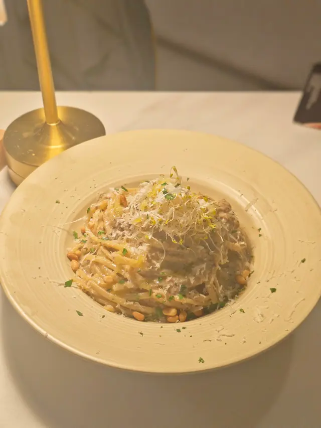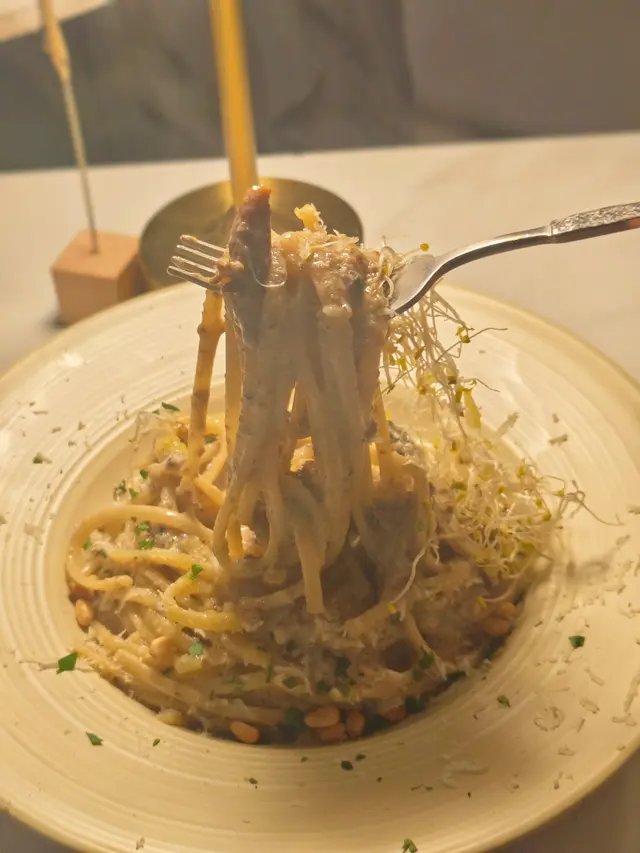 呢款絕對係菌香天花板💥!醬底熬入滿滿牛肝菌碎,仲撒咗香脆松子仁,忌廉醬濃滑不膩,扁意粉掛汁超勁,每啖都係濃郁嘅牛肝菌香,食到停唔到口~