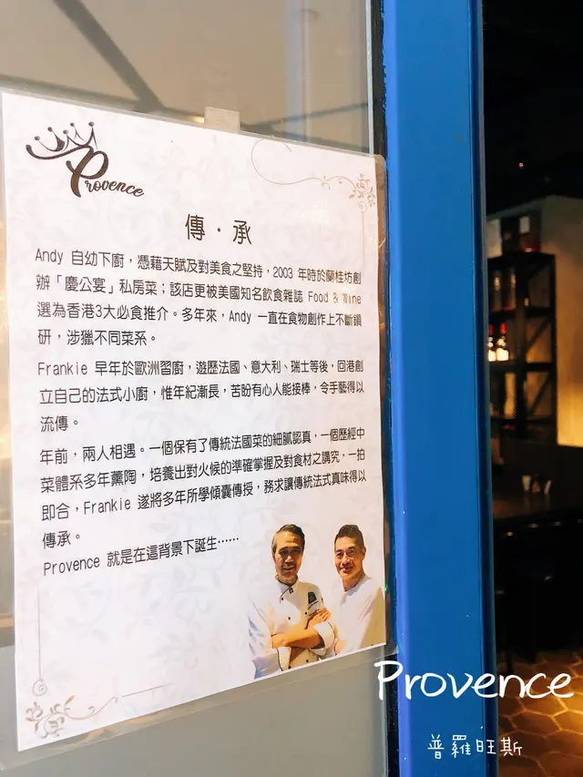 去到餐廳門口,發現「普羅旺斯」的兩位大廚並不是等閒之輩。看完這個簡介之後,令我和男朋友對於普羅旺斯的法國菜更加期待,希望可以一嚐傳統法式的風蘊及味道。