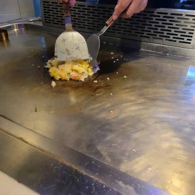 以日本珍珠米、蘭王蛋、蒜蓉和甘荀炒飯。師傳以純熟的手法,令米飯在鐵板上跳動,粒粒分明。材料雖然簡單,但炒得香,沒有肉都很美味。