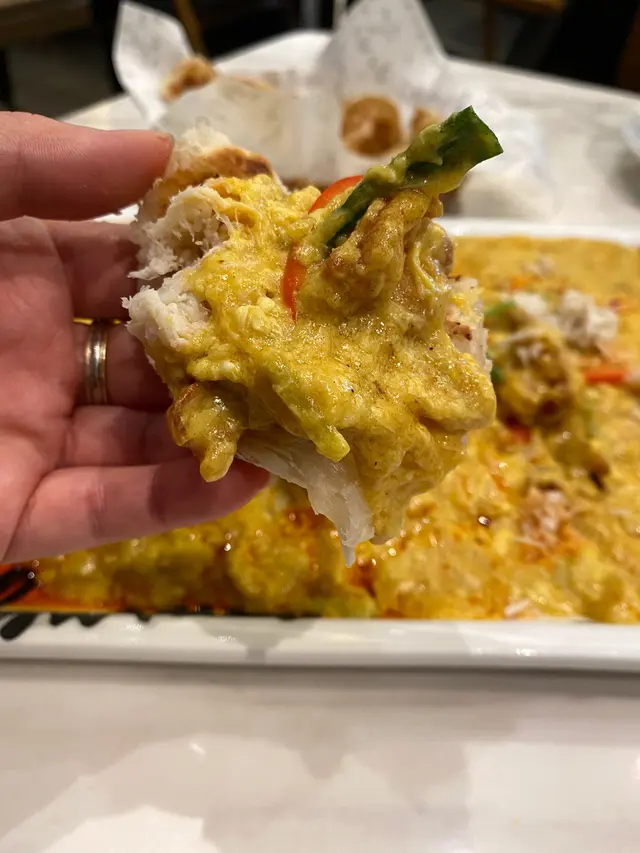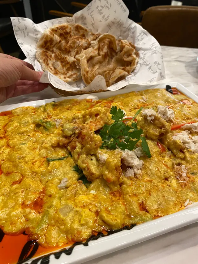 大頭蝦隻隻先炸香曬先再上咖哩汁,所以每一隻都脆卜卜,連殻都可以食埋。佢嘅咖喱味唔會辣,而且充滿椰奶香味,又有好多嘅蟹肉,所以食起嚟特別鮮甜。好似我哋咁樣,將印度酥餅搣下,擺一隻蝦,再加啲配菜,好多汁,就係完美嘅配搭。