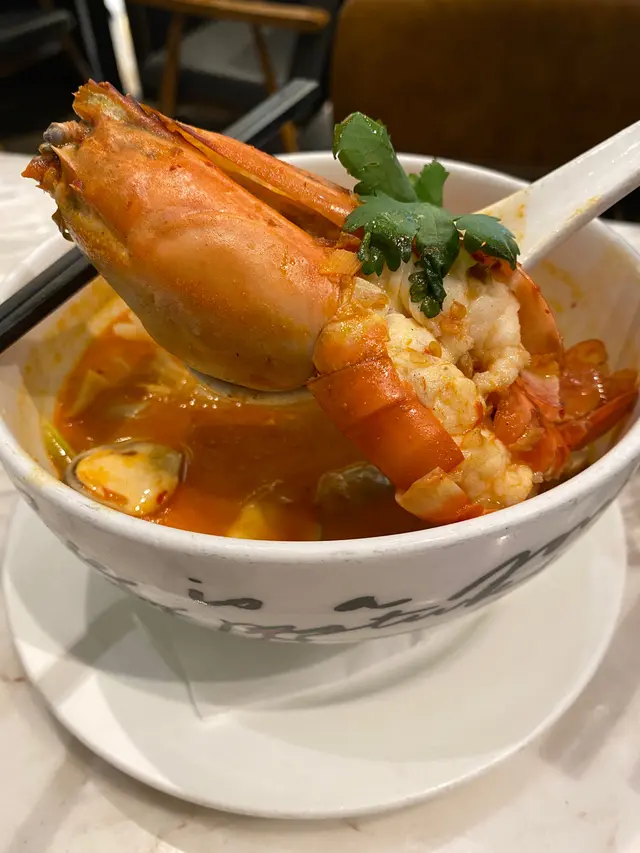冬陰功湯底好濃郁,但係又冇渣,食得到真材實料製成。河粉可以吸收晒湯底嘅精華,再配埋隻超大既大頭蝦,啖啖肉。