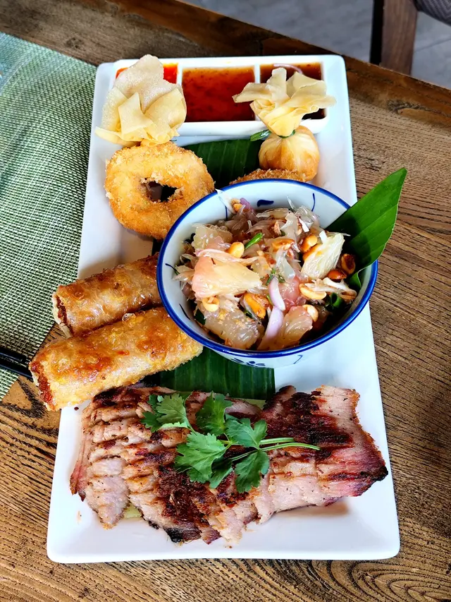 份量不少,非常豐富,有燒豬頸肉、春卷、魚餅、蝦餅、餃子及柚子沙律。豬頸肉燒得香脆可口,魚餅、蝦餅鮮甜爽口,真材實料,點上惹味泰式醬汁,味道更上一層樓。柚子沙律酸甜醒胃,再加上烤香花生,雙重口感,是很好的前菜。