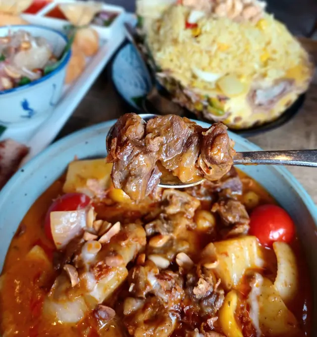 紅咖喱香而不辣,椰香味濃,牛腩腍軟可口,配有花生、薯仔、洋蔥等。花生增脆口感,薯仔融入咖喱汁,洋蔥添味,是非常好的配搭。