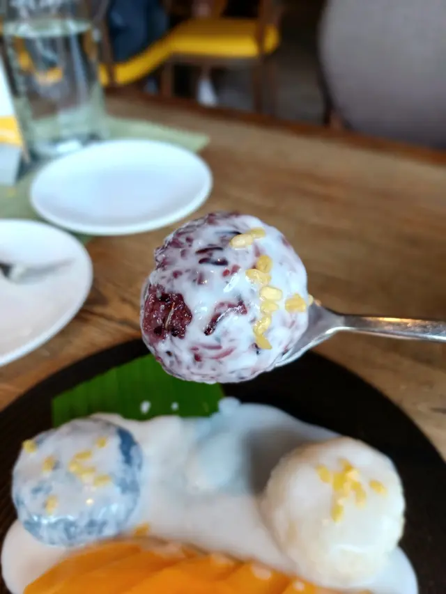 經典泰式甜品,製作一絲不茍:有三色糯米飯,三種口感味道。我最喜歡紫米的,柔中帶剛,雙重口感。配上香濃椰奶和半隻大芒果,是必食的甜品。