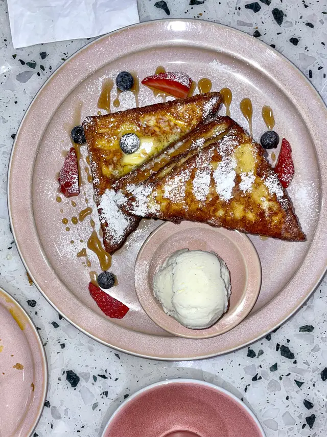 即叫即製嘅西多士散發著誘人嘅香氣,每一口都帶著豐富嘅奶香同蛋香🍞 佢哋喺每層中間搽左少少雜莓醬,為西多士添上一層清新的風味🫐 配埋上面嘅雪糕就有冰火交融嘅感覺,層次感豐富🍦 個人建議要加埋自家製海鹽焦糖或者楓糖漿,獨特嘅韻味同每樣食材都相得益彰😉