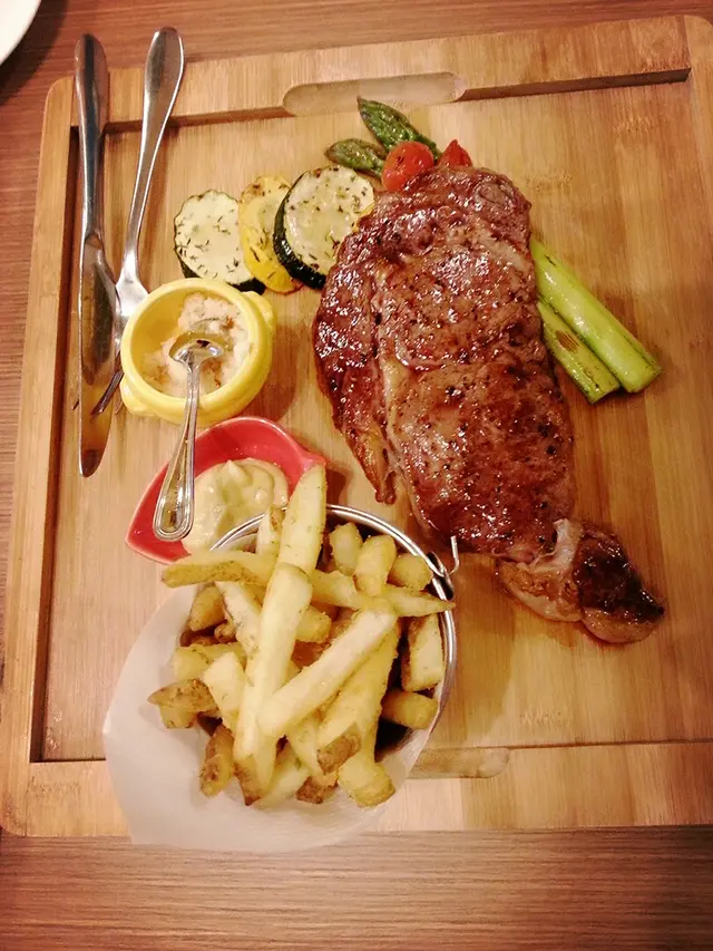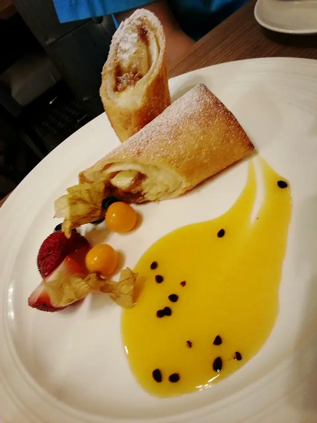 仲叫左牛扒啦,五成熟好juicy好味。甜品最愛apple crumble,好香牛油味唔太甜,仲有creme brulee,個焦糖面用匙一敲落去果下好清脆,仲見到粒粒雲呢嗱籽真材實料。朋友叫左個香蕉卷,我唔食香蕉唔知咩味,不過朋友就清左碟。