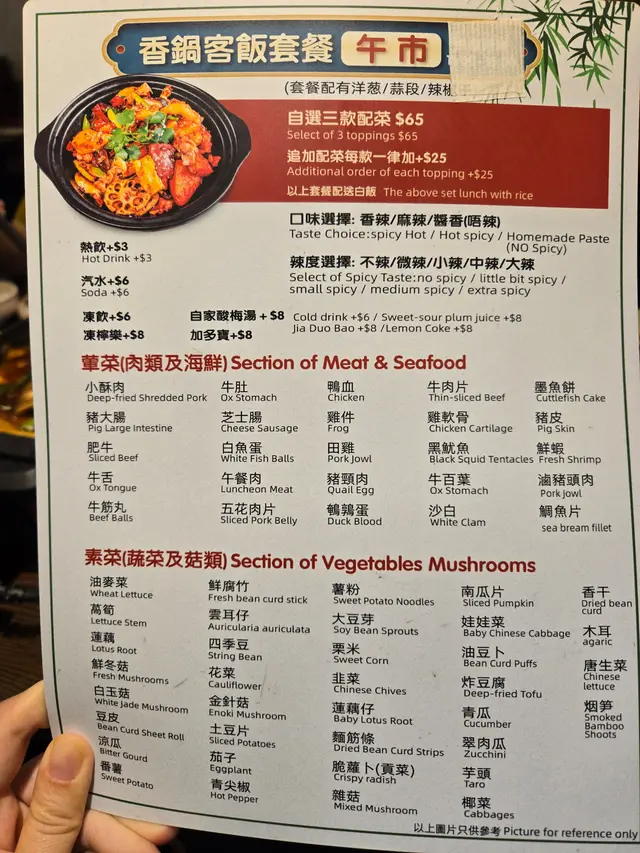我地叫完野食, 見周圍檯都食緊好似套餐咁既配搭時先知原來宜家佢地新開張, 所以午市套餐變左全日供應, 變相比起叫主餐牌抵食好多. 例如午市套餐$69有3餸香鍋+白飯, +$3仲有飲品, 比起叫一個大香鍋性價比高好多, 下次一定會試!