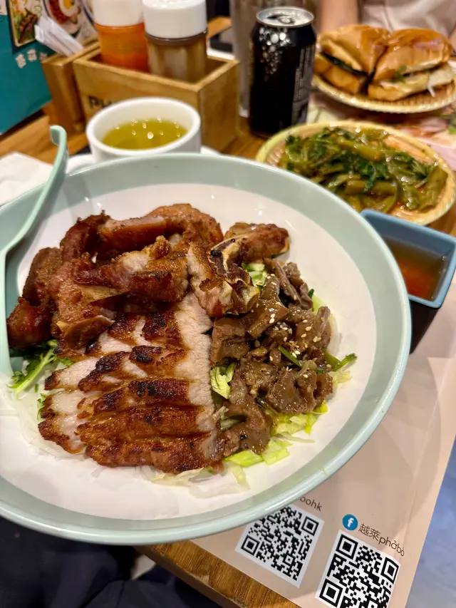 我叫咗越萊經典撈檬,一上枱就見到配料超豐富,有香茅牛肉、香茅豬扒同豬頸肉,再加生菜、青瓜絲同花生碎。魚露汁酸酸甜甜,撈埋檬粉一齊食,清爽得嚟又夠惹味。香茅牛肉煎得入味,牛肉軟腍唔鞋口;豬扒有少少焦香,肉質實在;而豬頸肉最正,肥瘦相間,咬落去爽口又多汁,三款肉加埋一齊食,層次感好豐富。