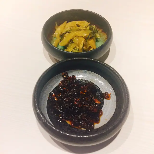 店員奉上自家製辣醬同咸酸菜各一小碟。辣醬辣味十足,只加一點點已十分香辣,要慎落。而咸酸菜咸味和酸味亦十足,已很多年沒有吃過,偶爾一吃也不錯。