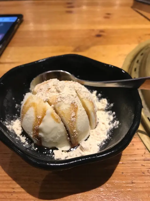 牛角食飯點唔少得牛角雪糕!雲呢拿味奶香味濃,重點係每啖都會食到甜滋滋嘅黑蜜,加上黃豆粉中和味道,感覺就好似食緊日式黑蜜蕨餅咁~