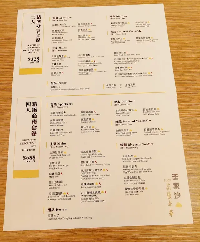 餐牌上除咗有好多特別嘅上海涼菜、點心、飯、麵、年糕、湯羮等,亦有多款特式套餐選擇,真的很不錯。
