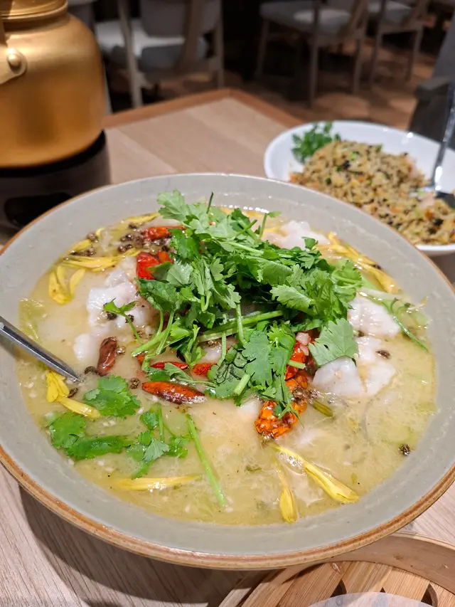 酸菜魚份量不少,龍躉肉雪白厚身,鮮甜嫩滑,酸菜清酸爽脆,其他配菜有萵筍、芽菜及水晶粉,十分豐富及飽肚。酸菜魚上面放上幾瓣菊花,雖然沒有甚麼味道,但感覺就是比較幽香。