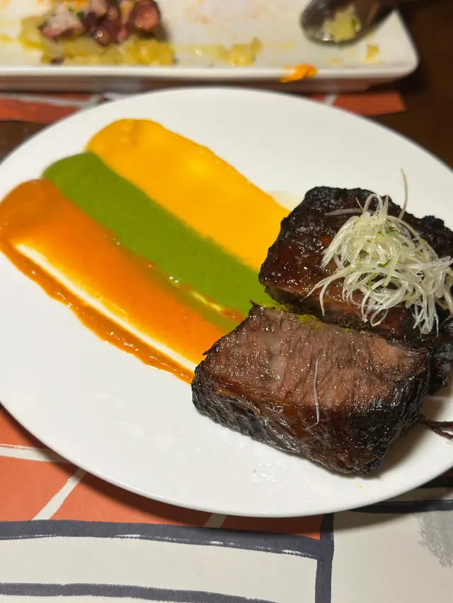 之後就係牛肋肉,佢係用咗慢煮烹調,所以唔需要選擇成熟度,呢個熟度啱啱好,每一件嘅牛腍身之餘肉汁鎖住,帶出牛味,食落完全冇血水滲出,咁就係慢煮嘅精髓👍🏻,又唔會熟到變韌,仲有三種唔同醬料嘅配搭,芫荽,南瓜同埋蕃茄醬嘅味道好夾😋😋