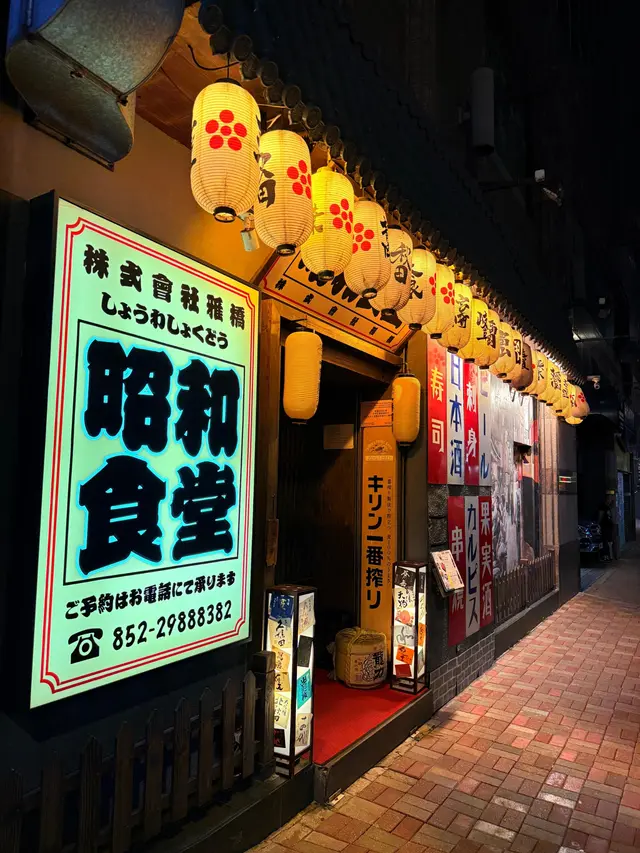 灣仔謝菲道入夜後人流不多,但其中一段食肆林立,而今次目的地昭和食堂,由遠處已可見非常日式的裝修風格,入夜後望著門面已有在日本的感覺。