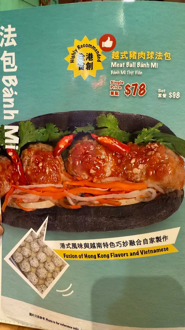 呢個「全港首創」嘅法包—竹炭法包焗到外脆內軟,豬肉球又香又Juicy,加上爽口蘿蔔、青瓜同肝醬超出位,一啖爆汁,出面真係食唔到!