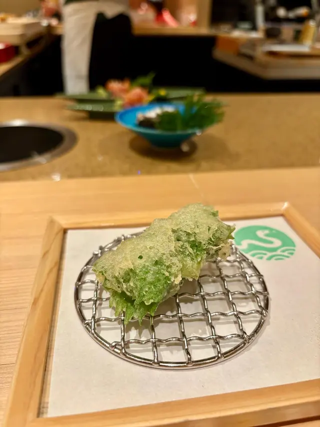 首先來的是沖繩縣花竹蝦,海蝦大隻且肉質結實,另外蝦頭和蝦尾也炸得脆口,用來佐酒一流。白子是用紫蘇葉包著炸的,吃起來味道濃郁,白子嫩滑像吃豆腐一樣。