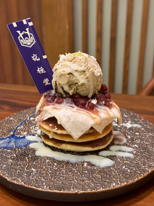這個甜品也相當🈶水平!班戟層疊,頂層焦糖脆皮👉花生醬👉榛子醬。上面再蓋張糯嘰嘰的“被子” 搭配焙茶雪糕球,層次敲級豐富!每一口都是不同感覺