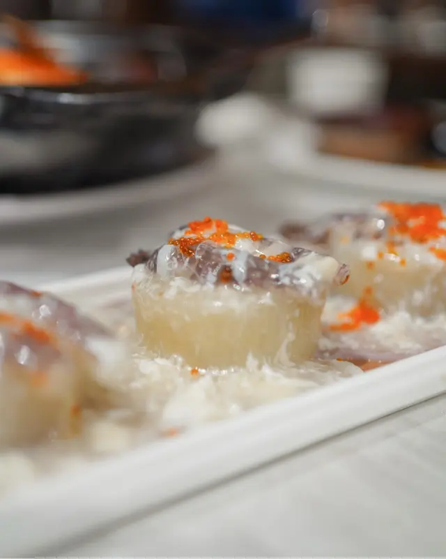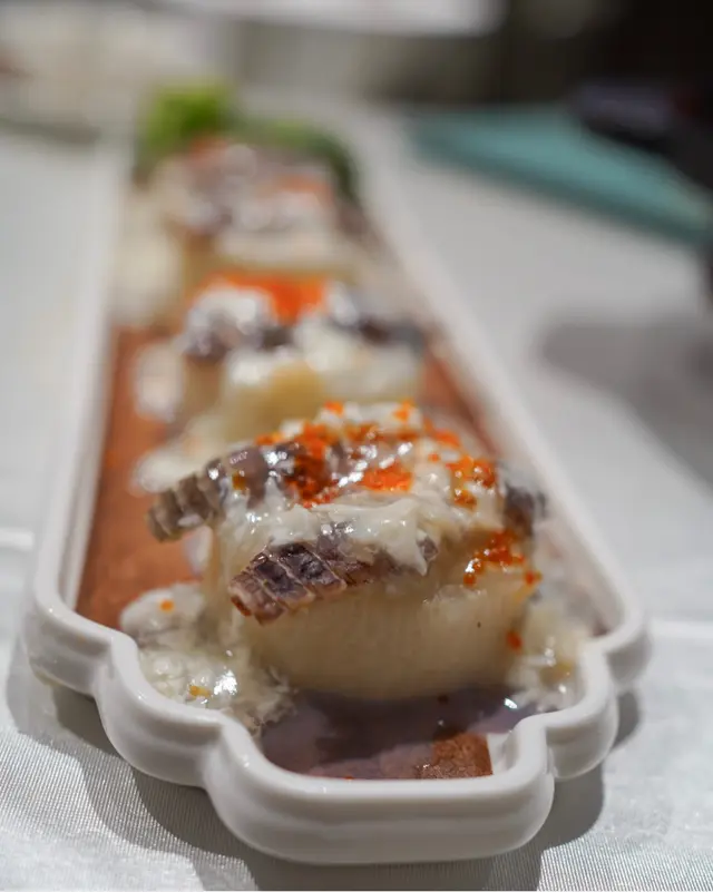 節瓜包住左元貝,上面加左已拆肉嘅瀨尿蝦,味道好清新但啖啖鮮味,加上用蛋白炒過嘅芡汁令菜式更顯香滑,上層配以蟹籽做裝飾,色香味俱全
