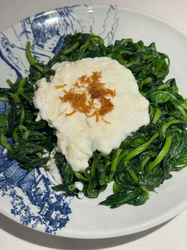 我哋食「烤魚自選組合」之前食咗個 $78「瑤柱蛋白扒豆苗」:豆苗新鮮爽脆,清炒完之後喺上邊加咗瑤柱蛋白,咁又豐富啲啲、好食啲啲🤣