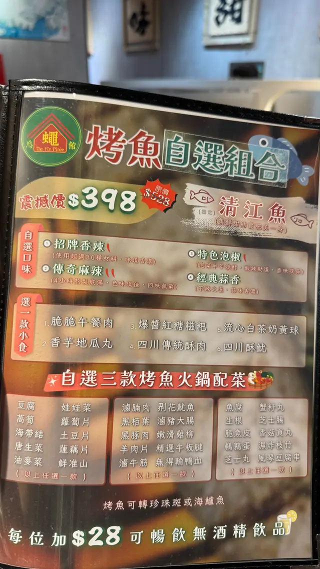 餐廳有特價 $398「烤魚自選組合」,包括「清江魚」(自選口味)+ 一款小食 + 三款烤魚火鍋配菜 🤣