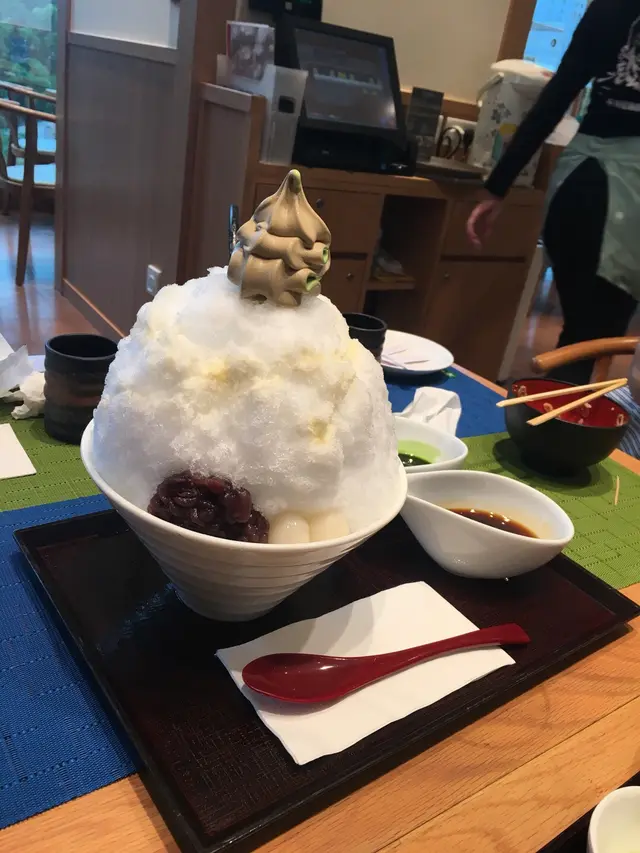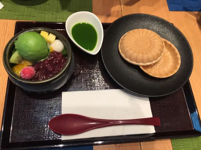 甜品就叫左宇治金時冰(抺茶&黑糖蜜)($98)和宇治金時餡蜜(抺茶)($98)。冰係一粒粒的碎冰,唔似綿綿冰,加入糖漿一齊食,透心涼。抺茶比較清甜,而黑糖蜜就香甜。餡蜜個餅乾夾抺茶雪糕同水果一齊食,正😋。碗裏面仲有紅豆丸子啫喱,一次個滿足幾個願望😍😍。