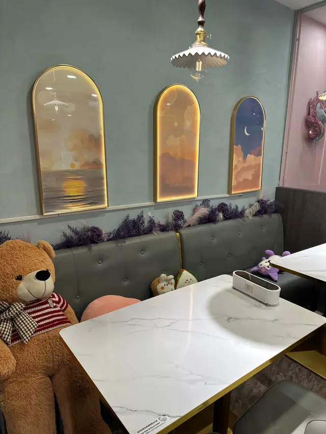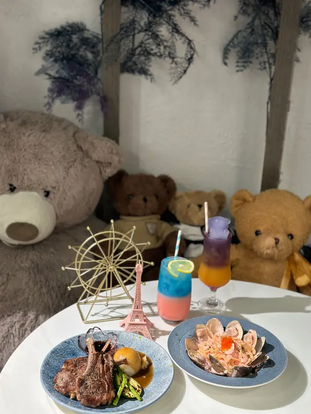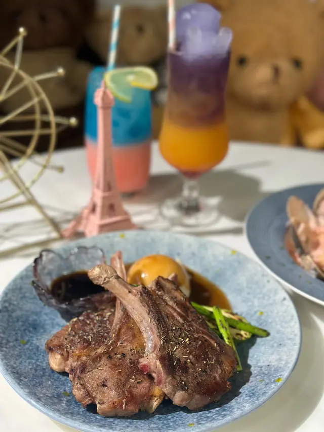 Cafe有lunch/dinner set,半價就可以加埋佢嘅特飲幾抵食。In general presentation 餐廳都花咗啲心思,明太子蜆肉蟹籽意粉,啲蜆肉堆砌得好靚好似一朵花咁包住中間嘅意粉,醬汁算濃郁,蜆肉大隻而且意粉都幾掛汁,至於羊架配薯蓉就有三件羊架,羊架同薯蓉味道都中規中矩吧,至於飲品就梗係叫佢哋嘅特飲,presentation好colourful,「千與星辰」有隻紫色啤啤熊冰喺上面,成杯drink都用紫色同橙色沖調而成,飲落去就有啲似雜果賓治嘅味道,至於另外一杯「夢幻」顏色比較pastel,用左白桃、乳酸、藍桔同梳打製成,口感清爽至於甜品就揀咗睡眠芝士蛋糕,味道比較甜、軟身同creamy,雖然唔係我最鍾意食嗰種芝士蛋糕類型,不過隻睡眠熊勁cute勁打卡
