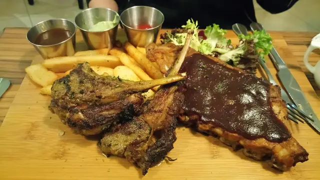 星期四晚荃灣晚餐人不太多,七點到沒訂位都立刻有位入位,當晚只有兩個set dinner,一個意粉 一個西冷牛扒,識得食更係叫牛扒$138。另一個就點了餐牌上的豬仔骨配羊扒$168。Set Din沙律或餐湯,選了沙律,正正常常。牛扒先到,肉質入口即溶,很不錯。