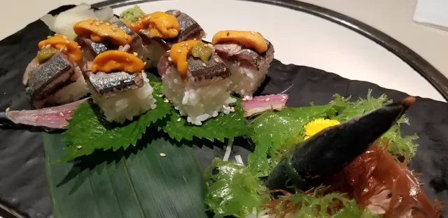 主角出場前,先來個刺身拼盤,秋意正濃,時令秋刀魚登場,餐廳侍應還做了秋刀魚兩食,一食是刺身,肥美鮮甜無比,師傅刀功一流,切得花巧,不失質感,每片份量恰到好處,太大片會膩,太少片又不夠喉,size就是剛剛好! 輕沾豉油芥末,秋刀魚的滋味就在舌尖上爆發出來,2018的秋天,吃了這一回秋刀魚,無憾! 另刺身拼盤有深海池魚,同樣貨源新鮮至極,瞌上眼吃下去,就好像去了築地一樣嘗鮮! 另還有三文魚腩,赤貝和帶子。 至於秋刀魚另一食,以壽司粉墨登場,配上海膽和柚子汁,一口咬下去,柚子酸更帶出秋刀魚的鮮味,配上香濃海膽混著壽司飯,味道多層次!