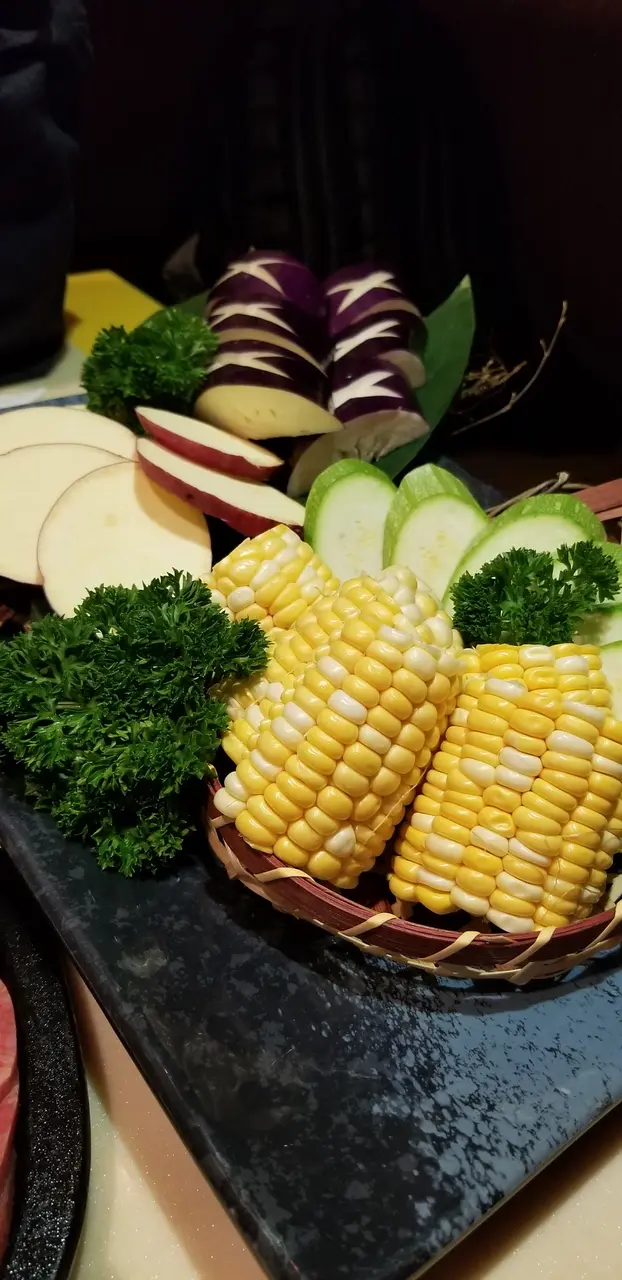 刺身拼盤都如此有誠意,主角和牛應該不得了! 和牛拼盤一上場,侍應細心解說從淡到濃的次序,怎樣燒才達至最美味,很有心! 在我口味,當然又要有油花又要有肉味,首選肉眼和西冷,餐廳佈局用心,先吃了油份少肉味濃的牛臀肉,腿肉,中間以蔬菜間場,再來個牛小排做平衡,最後以我的最愛作為總結! 這個精心安排令吃的人不會覺得太油膩,又可品嚐牛肉不同部位。經過今次侍應教路,令我對燒牛肉和蔬菜都增加了不小知識!