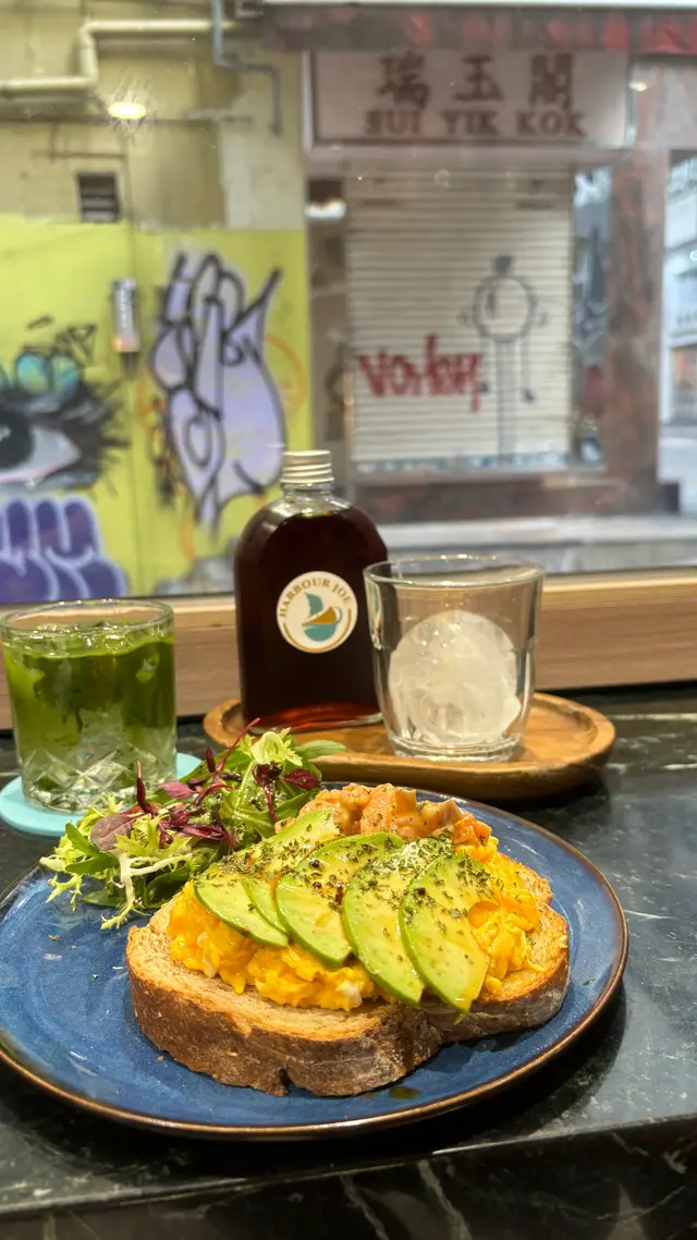 坐在窗邊,我點了一份**Sourdough Toast**,多士的酥脆口感搭配上牛油果、Salmon Tartare和Scrambled Egg,讓我感受到層次分明的美味。在窗外,帆船在海面上悠然地搖曳,彷彿在和我的午餐共舞,彼此交融,這一刻,時間仿佛靜止了。