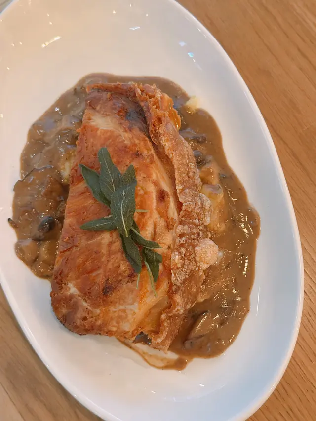 Italian Porchetta🐖跟餐$48💰意式烤豬腩肉非常厚身😱皮層烤至香脆😆但肉質略嫌偏鹹同太嚡🥺底下有薯蓉同黑蘑菇汁🥔🍄🟫