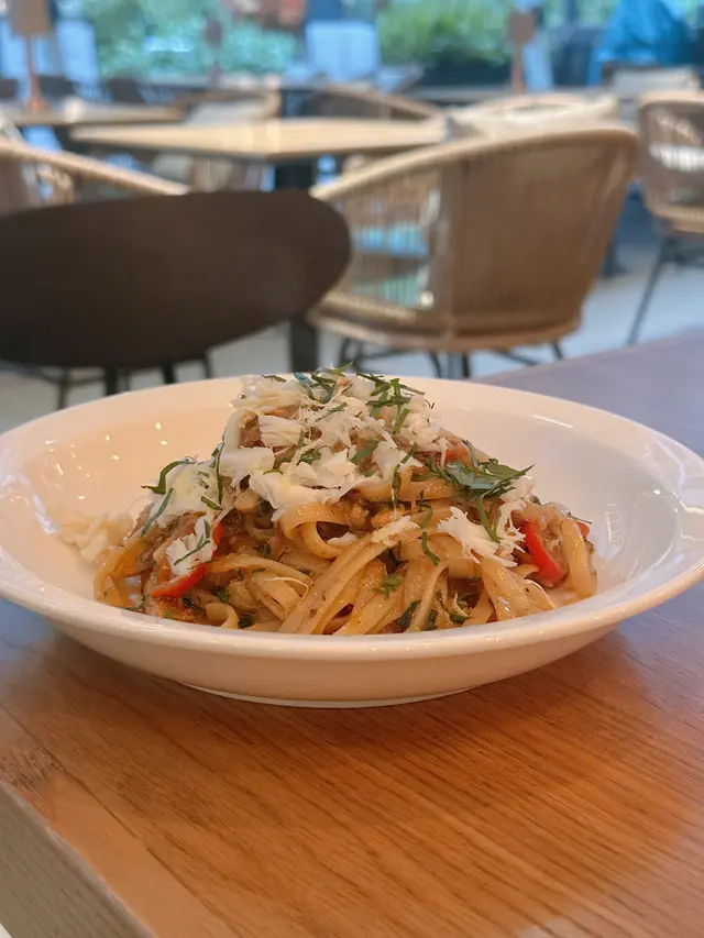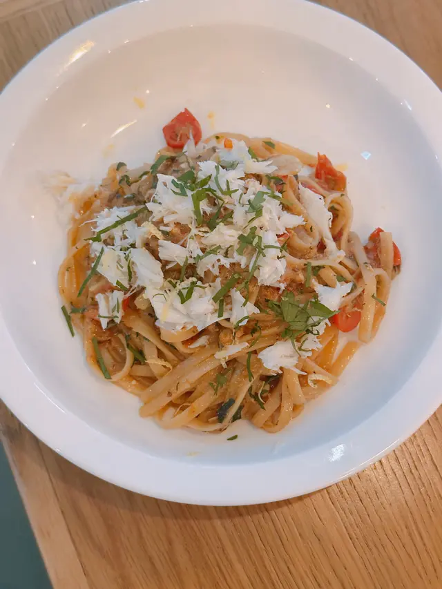 Crab Linguine🍝跟餐$28💰蟹肉意式扁麵🦀表面被初榨橄欖油包覆🫒加上辣椒🌶️ 車厘茄、羅勒葉🌿微辣口味😋