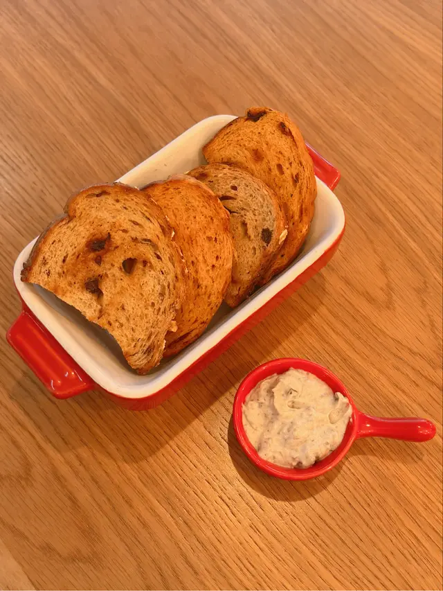 餐前麵包🥯免費💰有日曬番茄乾麵包同果仁提子乾🍅🍇烤得外脆內鬆軟😗配上松露巴馬臣芝士醬🖤