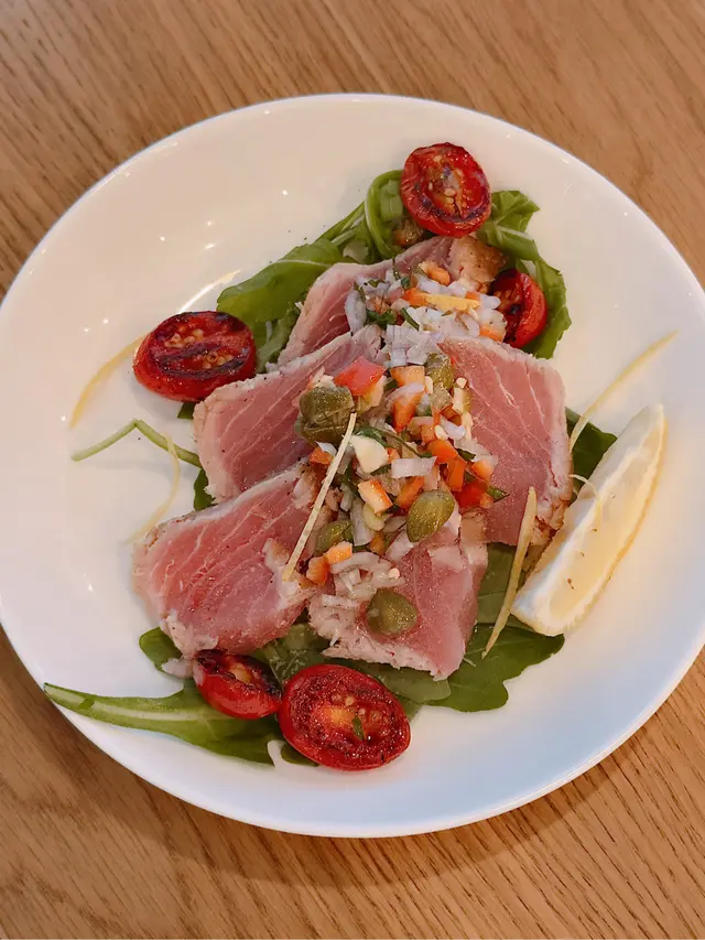 Seared Tuna🐟跟餐$48💰吞拿魚煎至半生熟🔥加上洋蔥🧅水瓜柳、彩椒🫑伴上車厘茄同火箭菜🥬再加上檸檬汁🍋清新開胃🤤