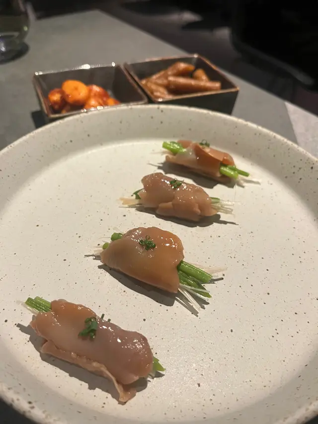 當季新鮮赤貝切片薄透,入口鮮嫩仲帶點脆感,入邊包住鮮嫩嘅蘆筍同京蔥絲,層次豐富,作為開胃前菜一流👍🏻