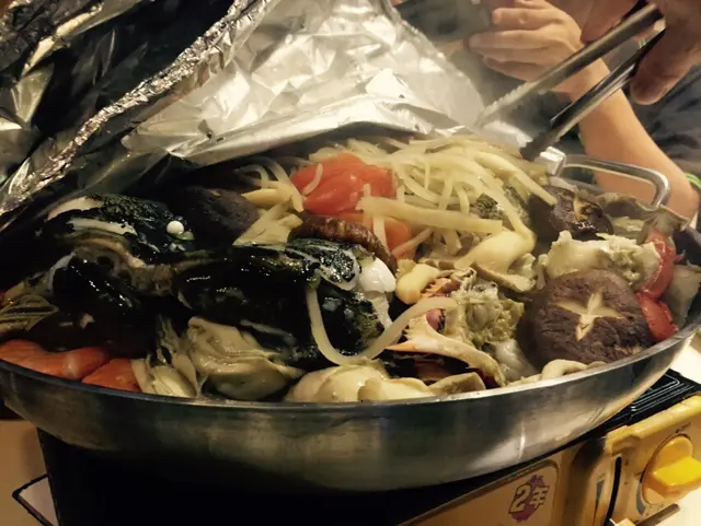 個盤主菜終於上台啦,佢用錫紙封住,店員話呢一款海鮮既煮法係用蒸同焗熟,以保存新鮮海產佢嘅原汁原味。聽落好有特色。