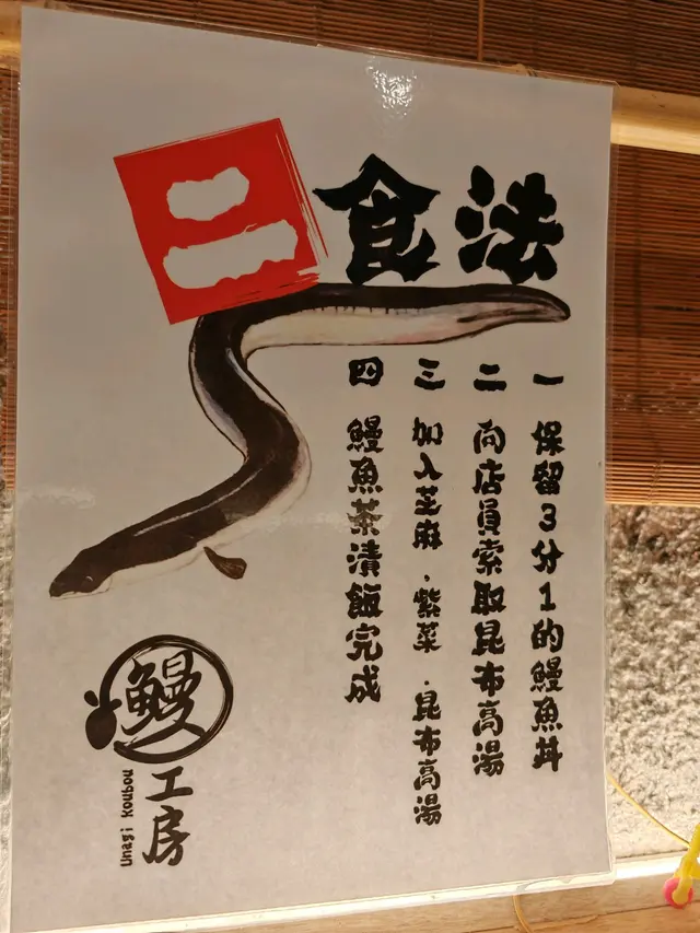 在等待的時候,見到牆上有一張教客人食鰻魚丼的二食法,見到都幾有趣,本想著一會都會這樣試,但最終都是給沙羅鰻魚打低我,下次來吃才可以二食了。