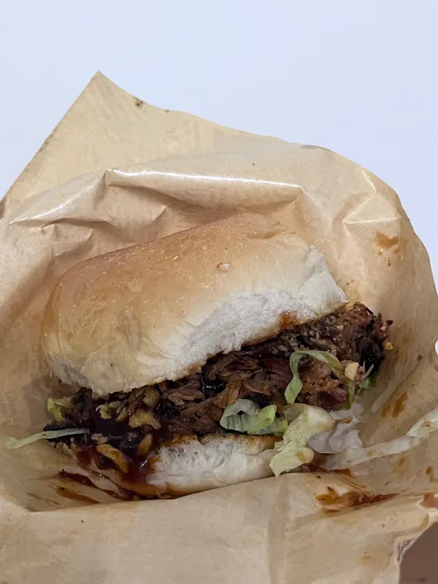烤汁手撕豬蒜爆漢堡用咗燒烤汁黎做調味,燒烤汁用咗美式嘅做法,食落去除咗甜甜地之外仲有燒烤嘅煙燻味道。濃稠嘅醬汁,所以掛到上去啲肉絲度,食嘅時候會濕潤同埋味道豐富。漢堡包嘅餡料加咗好多蒜頭粒,嗰啲蒜頭粒仲係炸過嘅,所以食落去風味十足。