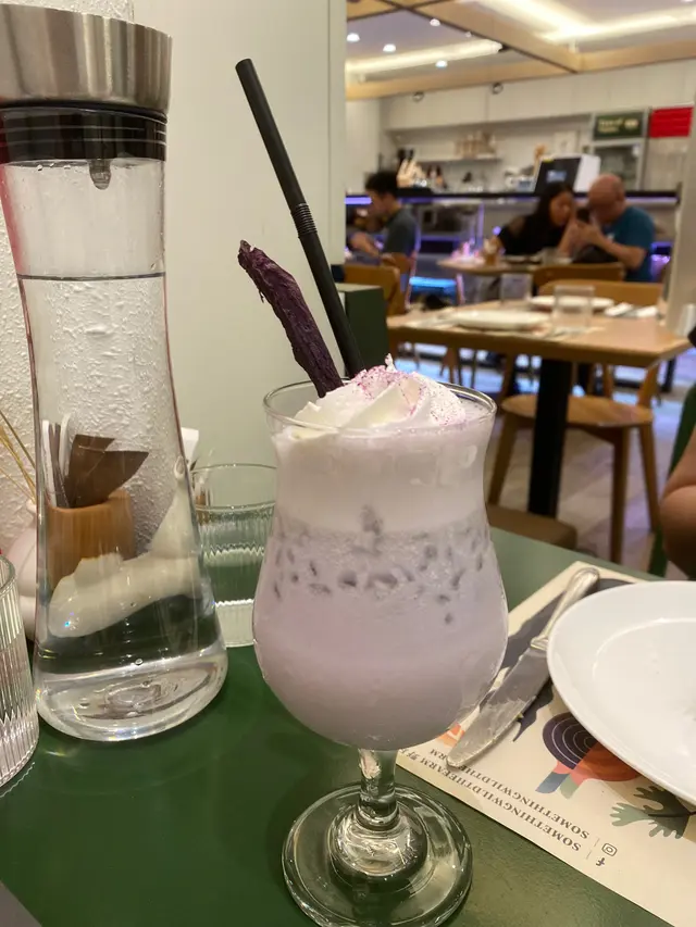 賣相好吸引😄奶紫色飲料,蓋上cream同碎紫薯粉,再配上半根紫薯,靚😍