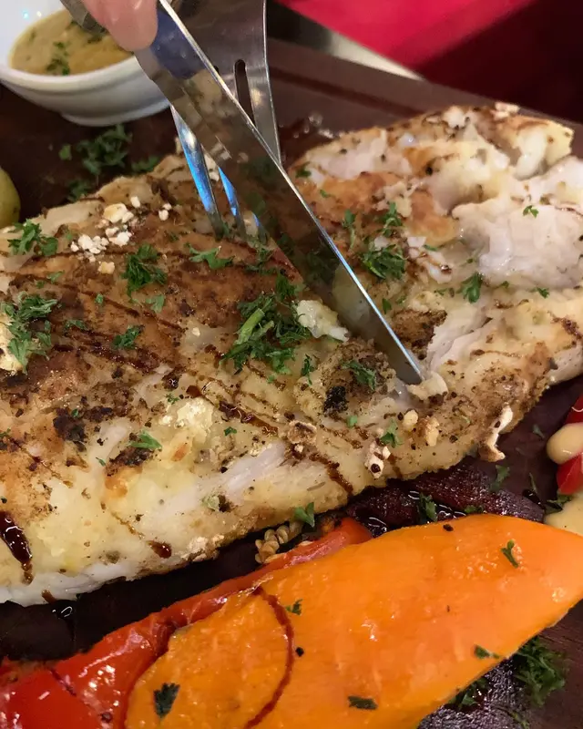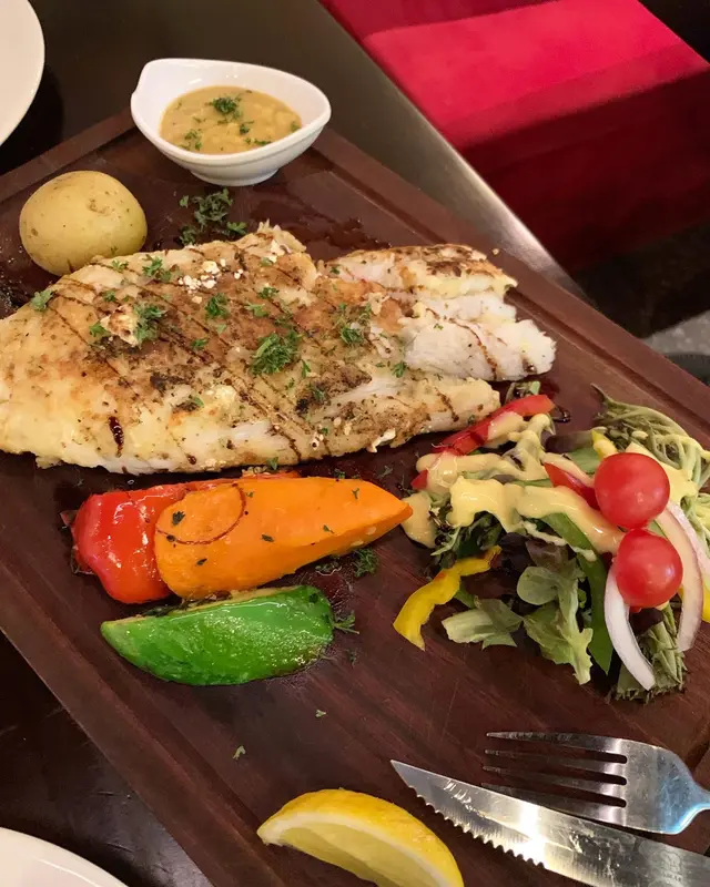呢個又係超巨型!超大片!用炭火燒!所以食落外脆內軟,魚肉鮮甜嫰滑,同時也保留了魚汁,本身已經調左味好香口。可以自選醬汁有奶油芥末/檸檬牛油/迷迭香/胡椒/蘑菇/肉汁,我哋揀咗檸檬牛油。好清香,牛油味好香但點少少就夠了。而配菜配菜都可以自選:烤雜菜/蒸米飯/薯蓉/薯條,我揀左烤雜菜有三色椒、翠玉瓜同沙律菜,全部都烤得好香😆😆😋