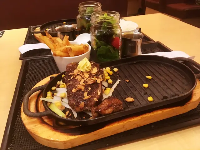以前加配樣樣十幾蚊,仲要嚟到唔得激鬼死,但宜家廿九蚊選三款,仲要頭先見到個樣都可以,白飯無特別嘢講,炸薯條仲微䁔,炸得剛好,外脆內軟帶薯味,粗鹽調味;野菜沙律用沙律菜夠新鮮,少許好似泰式醬,酸酸地幾好,但前菜同扒一齊到,鐵板唔等得,即係迫住做餐後菜,依個就另一間做得好,佢哋前菜同飲品都會先上;飲品門口餐牌無寫,入面餐牌有寫雪梨汁,但無貨,改叫是日水果茶,菠蘿茶,只有凍,仲倒得偏少,但比之前飲過嘅水果茶調得自然,首先唔過酸,出面水果茶會另外加堆水果,但味道唔格,只有好睇,出嚟效果永遠得個酸寫,後加水果搶咗本來味道,感覺就係䁔紅茶加生果出到嘅味,煲嚟唔知為嘜,而依個有鮮菠蘿味之餘,茶味又出,兩者平衡得好。凍滴咖啡最抵飲,原加配就要廿二,營養補充飲料嘅玻璃瓶,掛牌寫滴咗十二個鐘,香味普通,味道唔濃,水同咖啡仍有種分離感,微帶果酸同苦味,初嘗者都飲得落既味道。