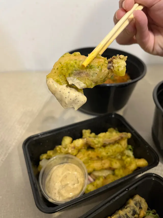 磯燒魷魚天婦羅配黑椒蛋黃醬