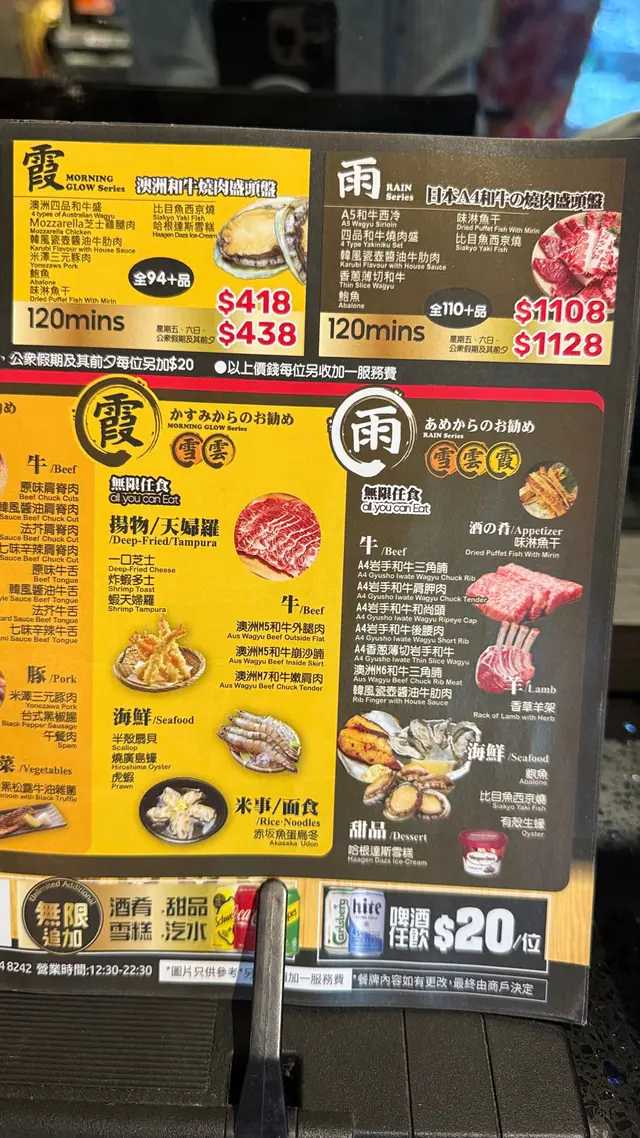 套餐 雨”A4和牛120分鐘110品無限任食燒肉放題,讓你一次滿足對和牛及肉類的渴望。