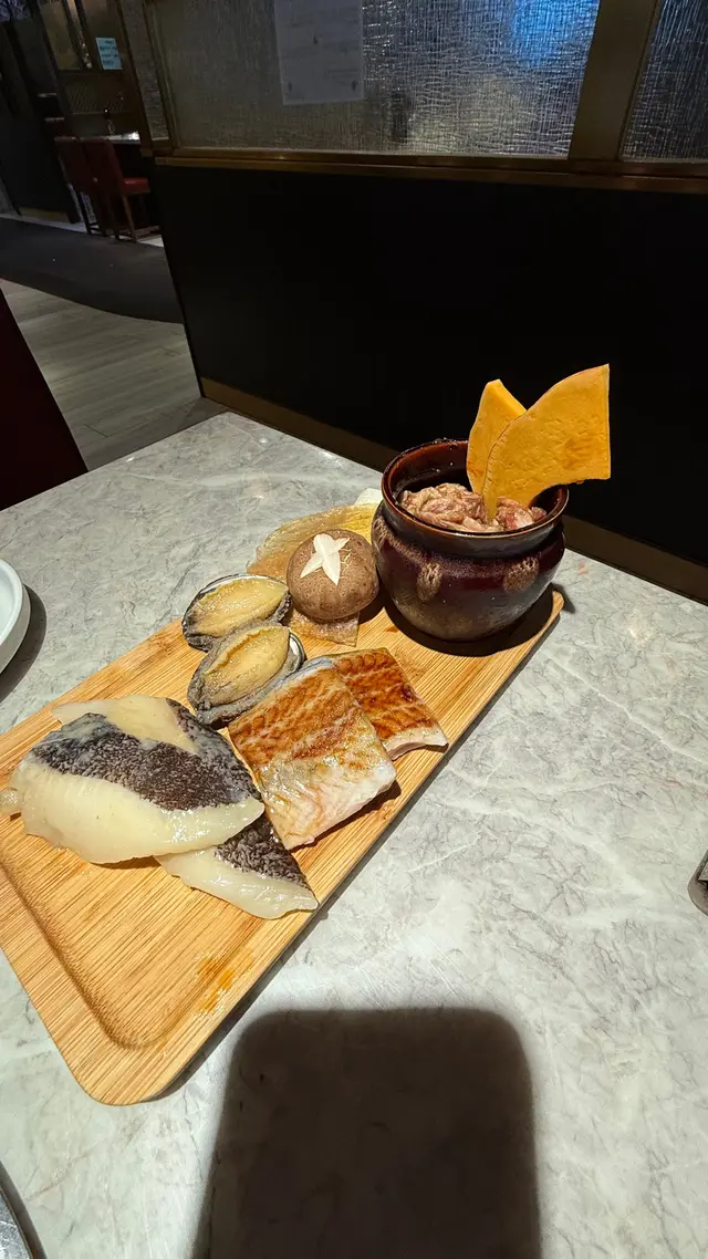海鮮拼盤有 鮑魚,味淋魚干,比目魚西京燒,厚切鰻魚。鰻魚去骨啖啖肉,鮑魚新鮮,比目魚嘅油脂分布非常好魚油味濃郁,而且仲好特別竟然有雞泡魚乾,簡直係大滿足。