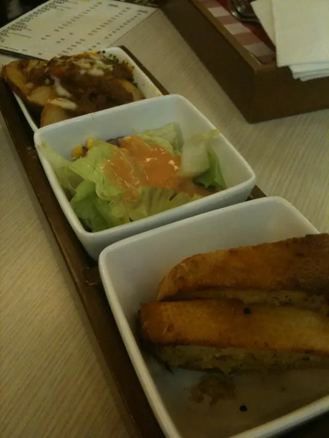 唔係主角嘅小食併盤都好出色。近鏡頭嘅法包抺左混有香草嘅蒜頭粒,很有心思。中間嘅凱撒沙律好清新。而薯條比快餐嘅大條,而且有好多好多醬汁! 餐牌寫係美式狂牛肉醬。