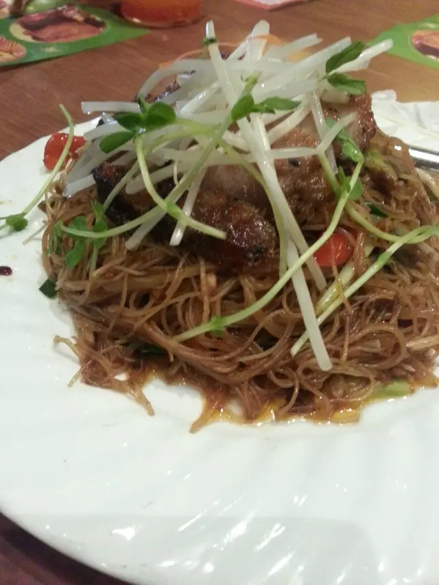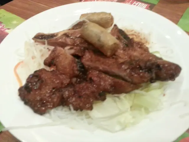 我同同事的豬扒撈濛先到,但好奇怪我的沒有春卷,他的有春卷,可能攪錯了,份量好大碗呀,豬扒都好大塊,濛粉入面有些生菜絲,甘笋絲及花生碎,豬扒都好淋身入味,好味道呀. 加埋D魚露及辣椒醬一齊食,好開胃,好味,春卷好硬,麻麻地,反而同事春卷濛的春卷好味D,出面有些好似網既嘢,都好香脆及入面係香芋,好食呀.