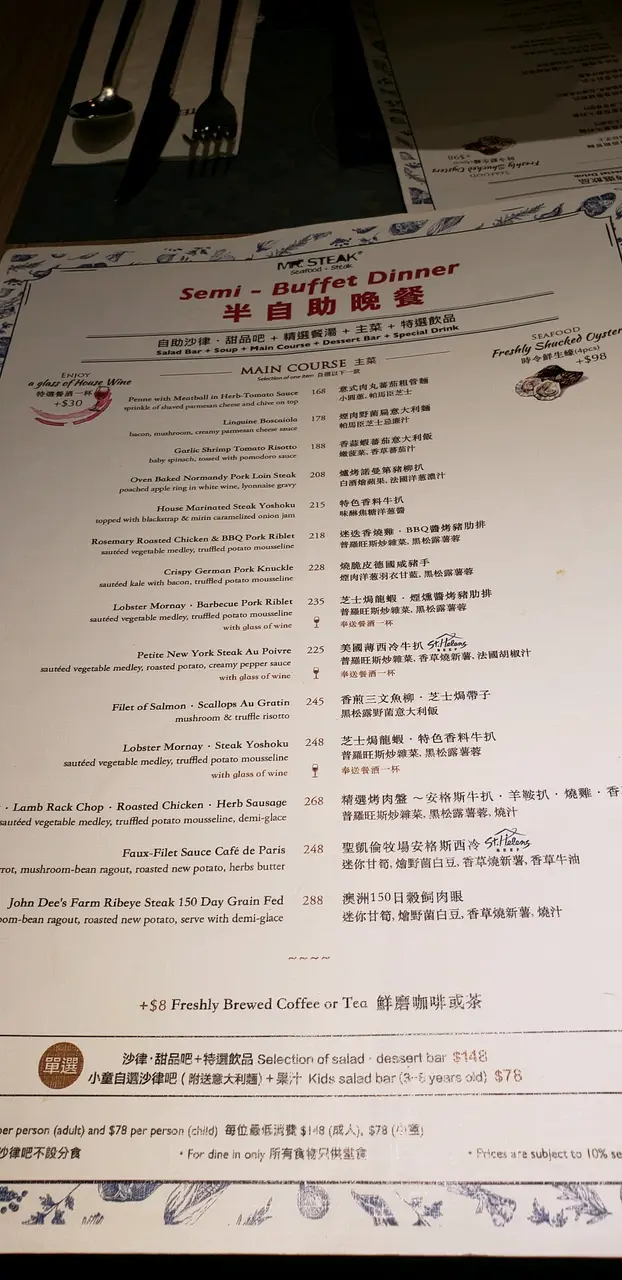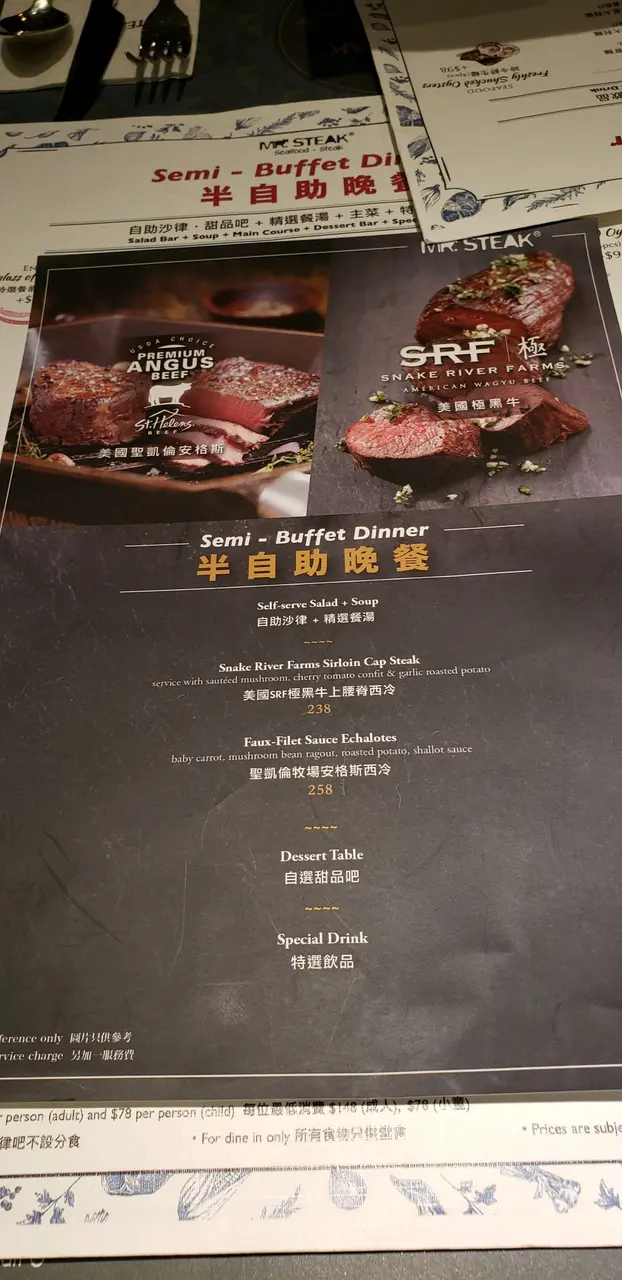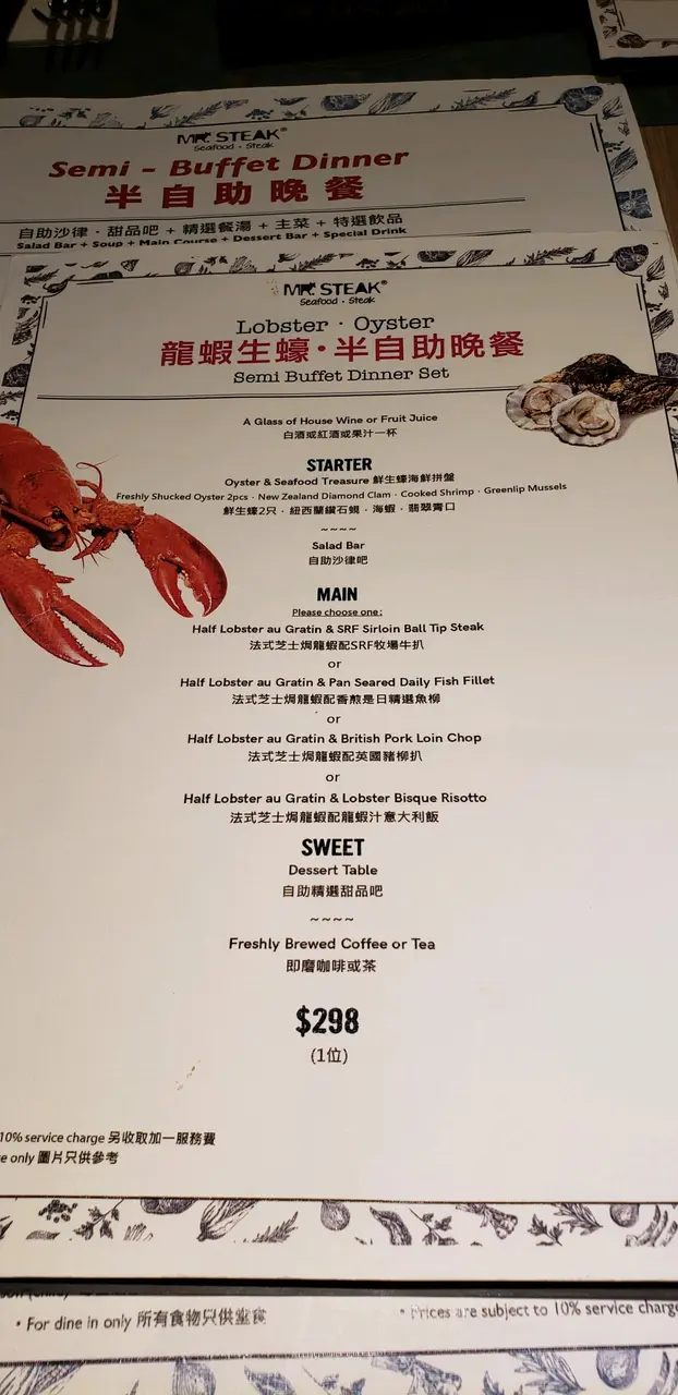 第一次幫襯的感覺 XXX2003等级32019-08-19336 浏览 关注 常常聽人講Mr. Steak銅鑼湾店D buffet唔錯。OH, 比我發現坑口站都有間Mr. steak, 雖然係semi-buffet ,但都試下啦。主菜,我叫左個龍蝦牛扒,5成熟。主菜做得好差,1D都唔好食,牛扒整得太差了,食材屬一般貨質。失望餐廳本身環境唔錯,但服務員安排我們坐第一張枱,非常近門口,同坐門口無分別。頭盆同甜品都是任食,頭盆唔錯,值得讚。甜品一般,好多甜品是入货的。整體上覺得唔值3佰幾蚊個 dinner。以上食记乃用户个人意见 , 并不代表OpenRice之观点。赞好分享第一次幫襯的感覺 牛扒先生 (東港城) https://s.openrice.com/QrLT0OOur00检举 张贴 评分3味道4环境3服务3卫生2抵食用餐日期2019-08-08等候时间5 分钟 (堂食)人均消费$320 (晚餐)